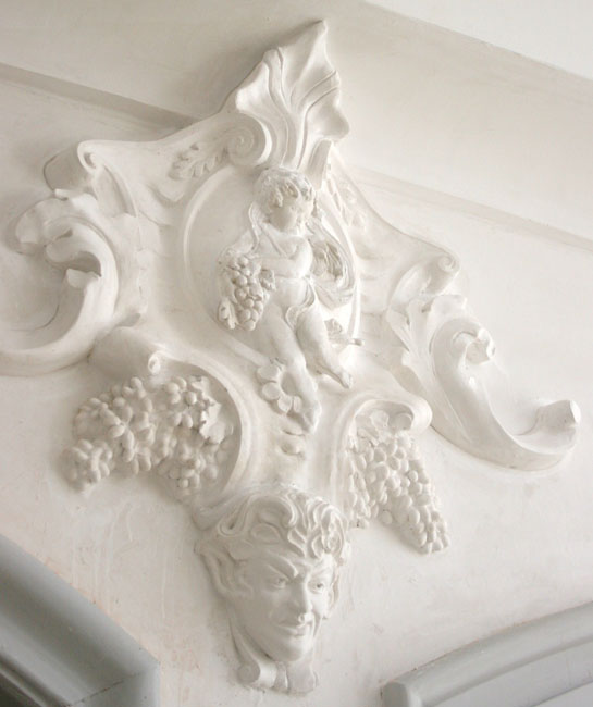 Mit besonderer Liebe schmückten die Stukkateure die Kehle unter der Galerie. Vierzig schlanke Doppelkonsolen, darauf Köpfe von Harlekinen, teilten und rahmten sie in etwa einen Meter lange Felder. Wechselnd geformte Rahmen umschlossen hängende Bündel von Musikinstrumenten oder musizierende nackte Knaben. Gemäß dem Style-Régence waren alle Formen hell, klar und symmetrisch und fern vom Überschwang in der Willkür des Rokokos.