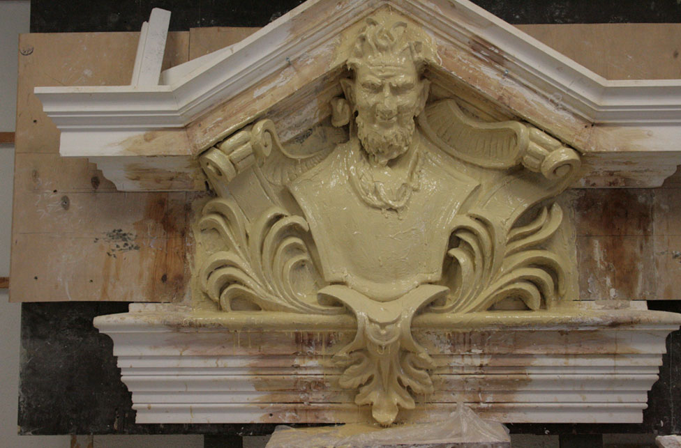 Reduzierter Stuck bildet den Rahmen für die Fundstücke des im Zweiten Weltkrieg zerstörten Neuberkamins.